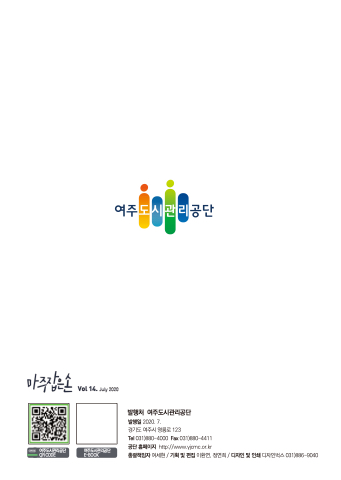 Vol 14. July 2020 여주도시관리공단 QR CODE 발행처 여주도시관리공단 발행일 2020. 7. 경기도 여주시 영릉로 123 Tel 031)880-4000 Fax 031)880-4411 공단 홈페이지 http://www.yjcmc.or.kr 여주도시관리공단 E-BOOK 총괄책임자 여세현 / 기획 및 편집 이환연, 정연희 / 디자인 및 인쇄 디자인벅스 031)886-9040