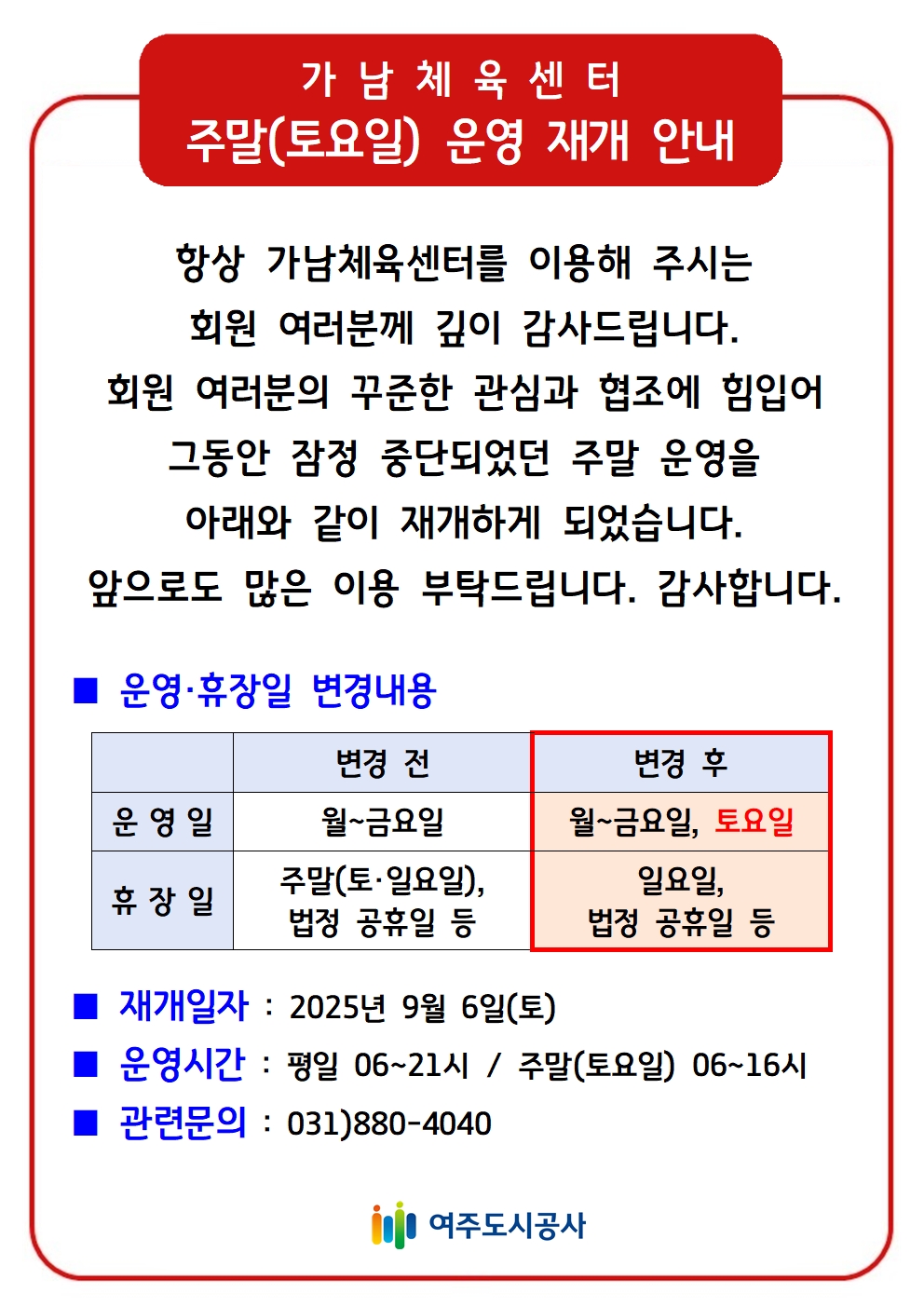 ★주말(토요일) 운영 재개 안내★9/6(토)부터★