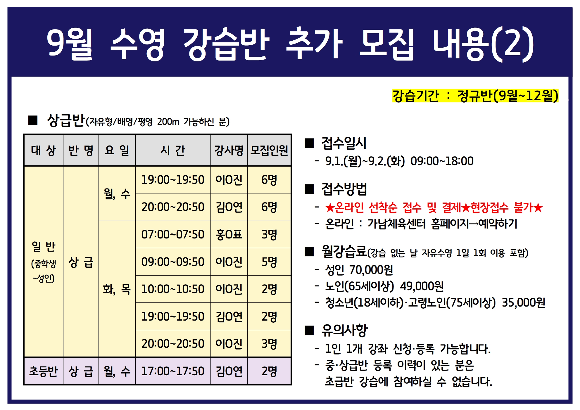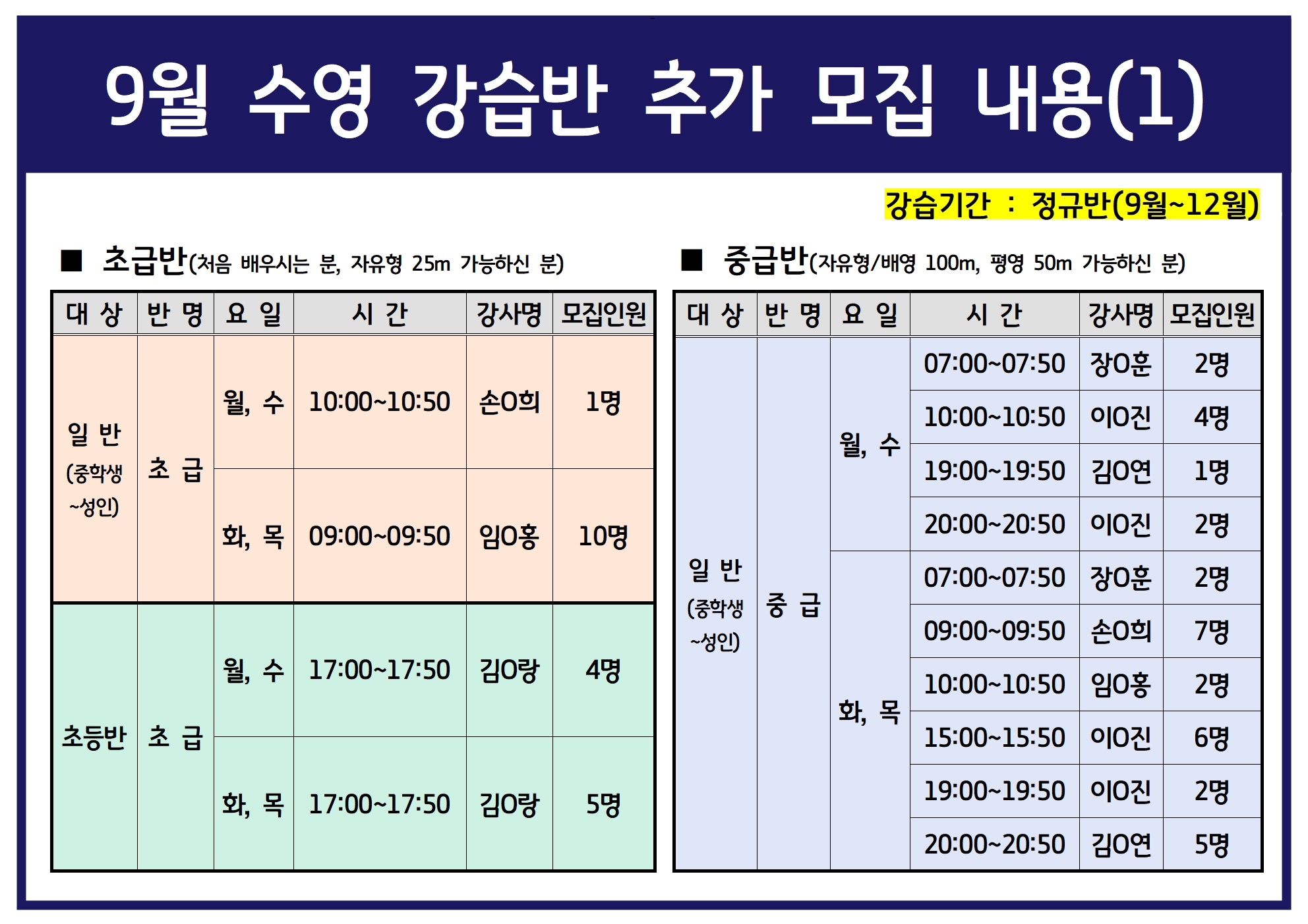 9월 수영 강습반 잔여석을 다음과 같이 추가 모집하오니 많은 신청 바랍니다.