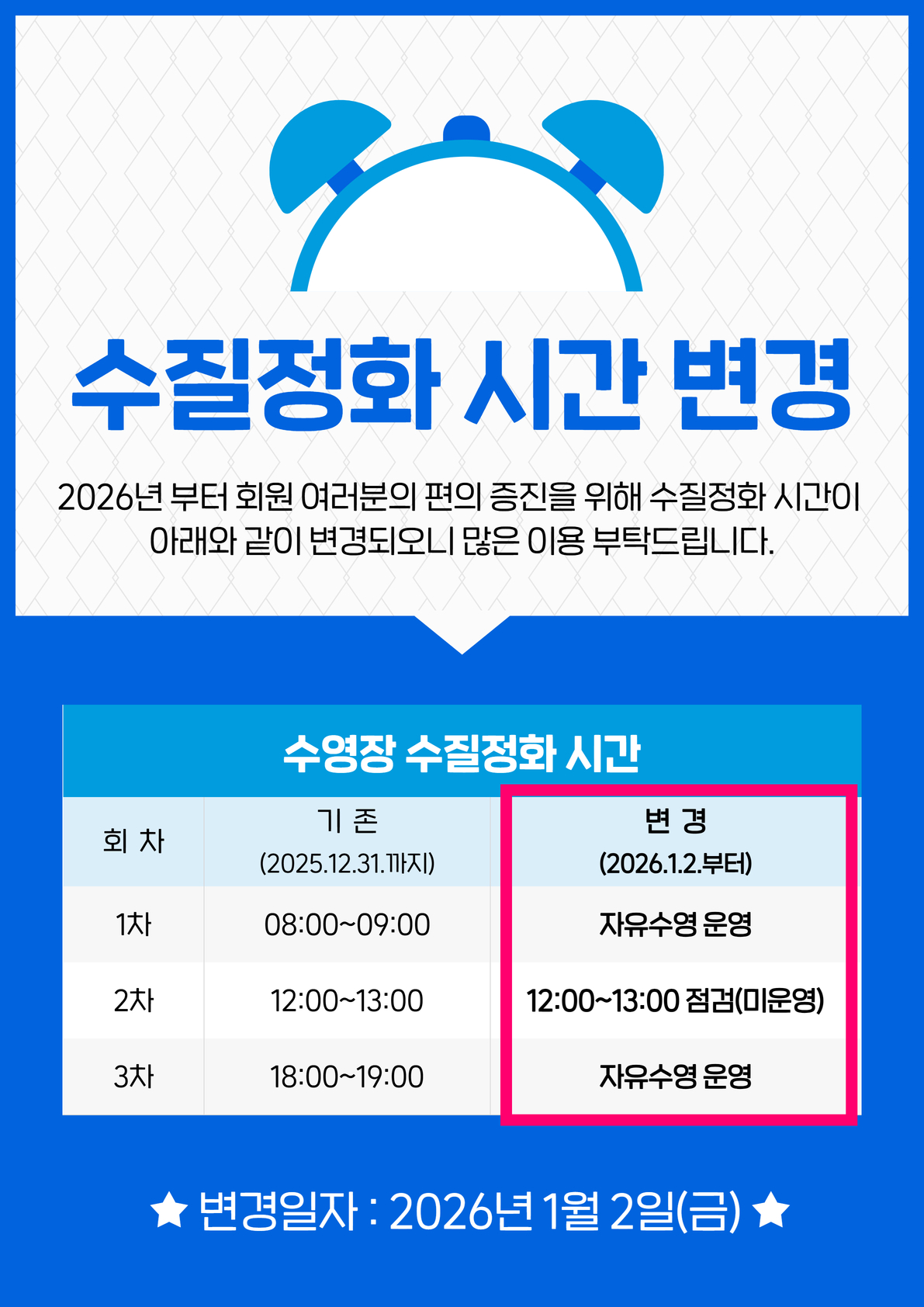 수영장 수질정화 시간 변경 안내(2026.1.2.부터)