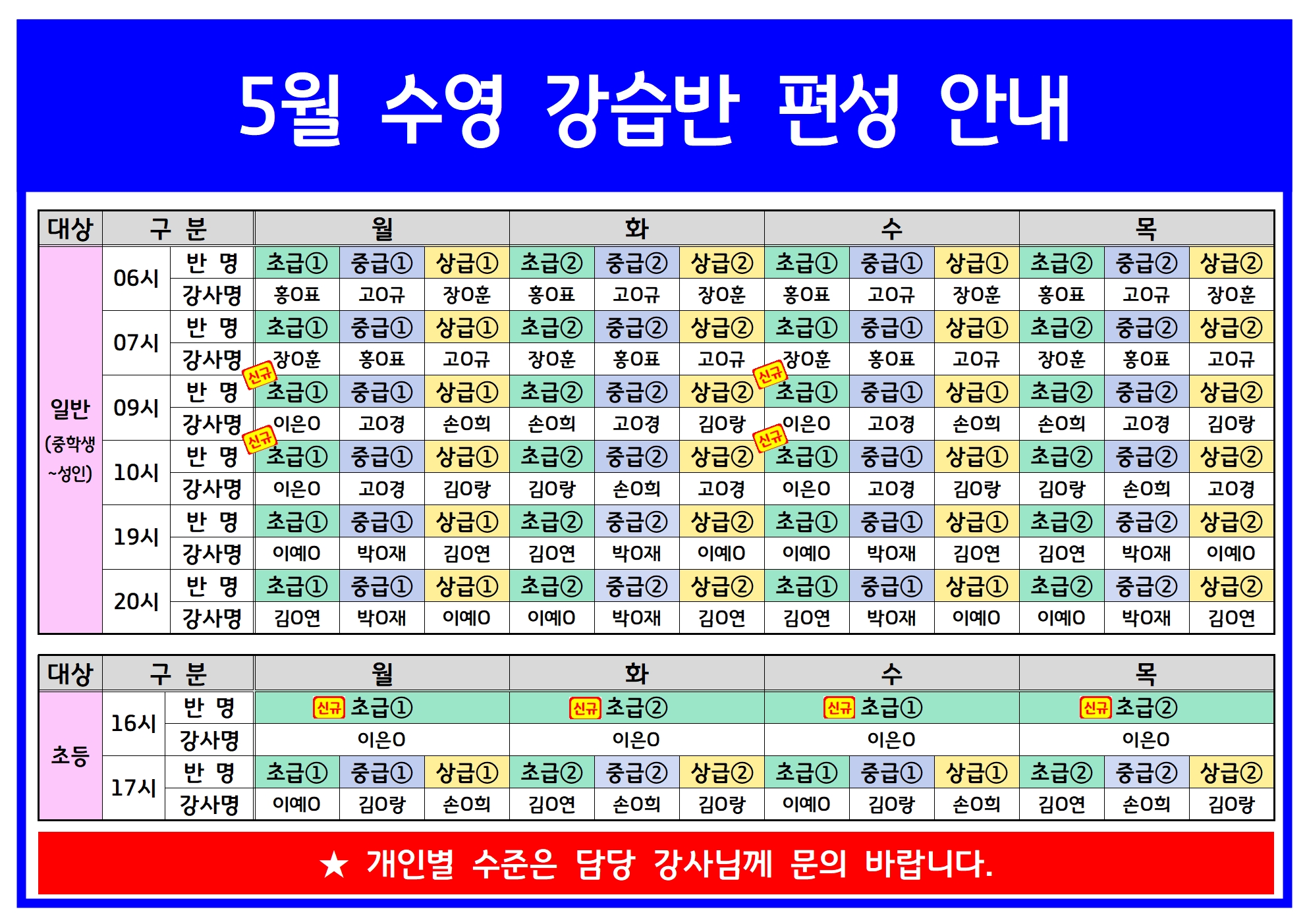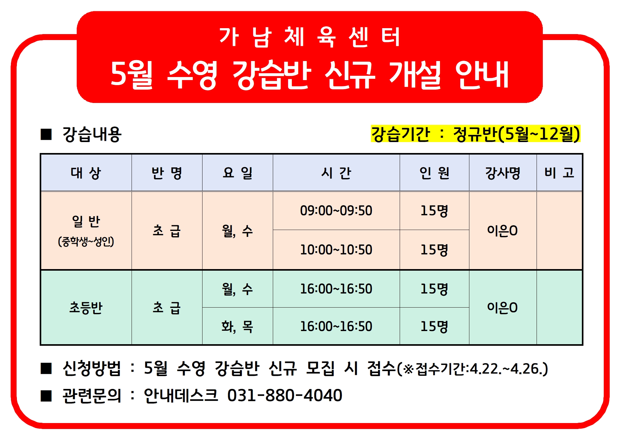 5월 수영 강습반 편성 및 신규 개설 안내(접수기간:4.22.~4.26.)